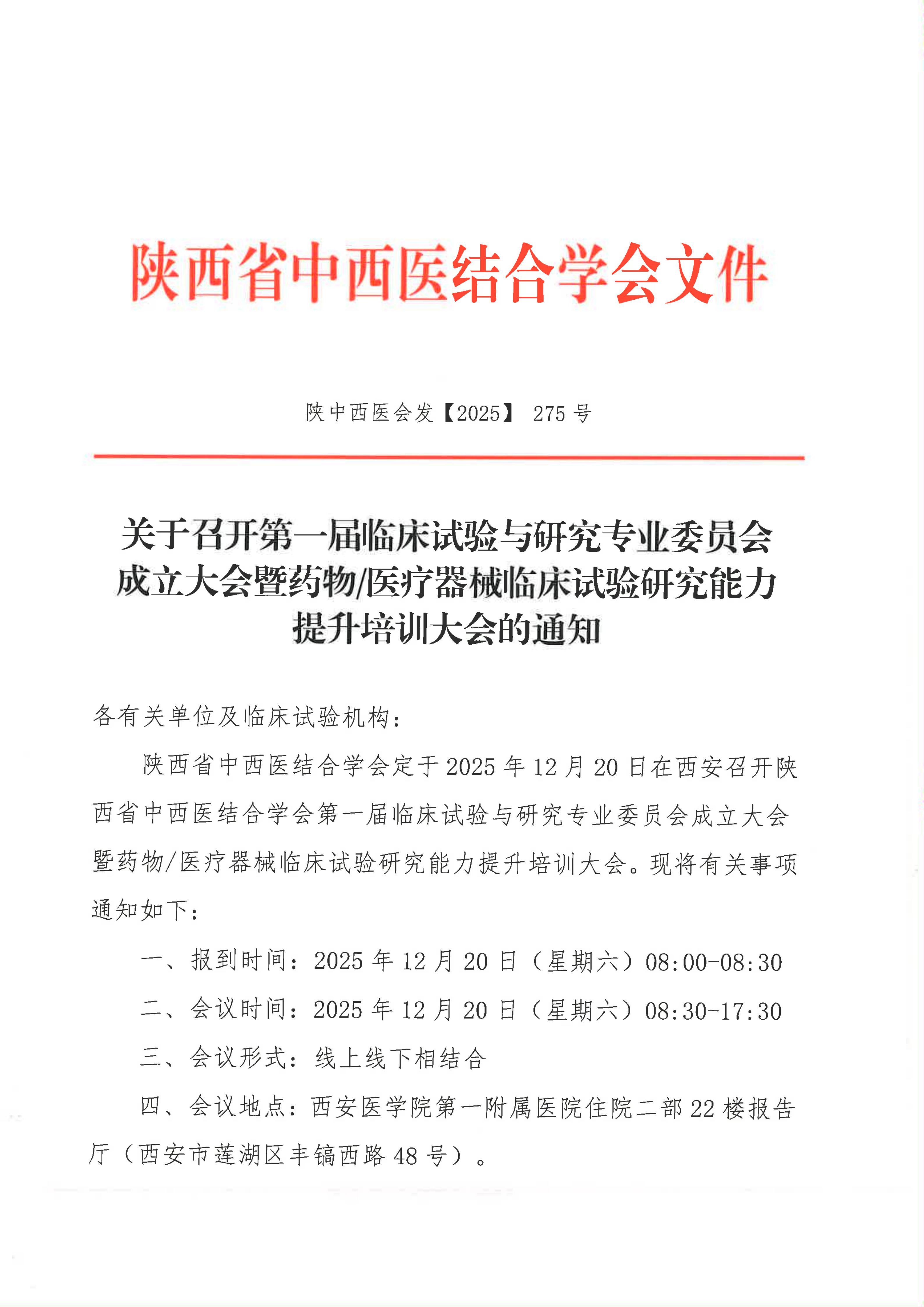 关于召开第一届临床试验与研究专业委员会成立大会暨药物/医疗器械临床试验研究能力提升培训大会的通知