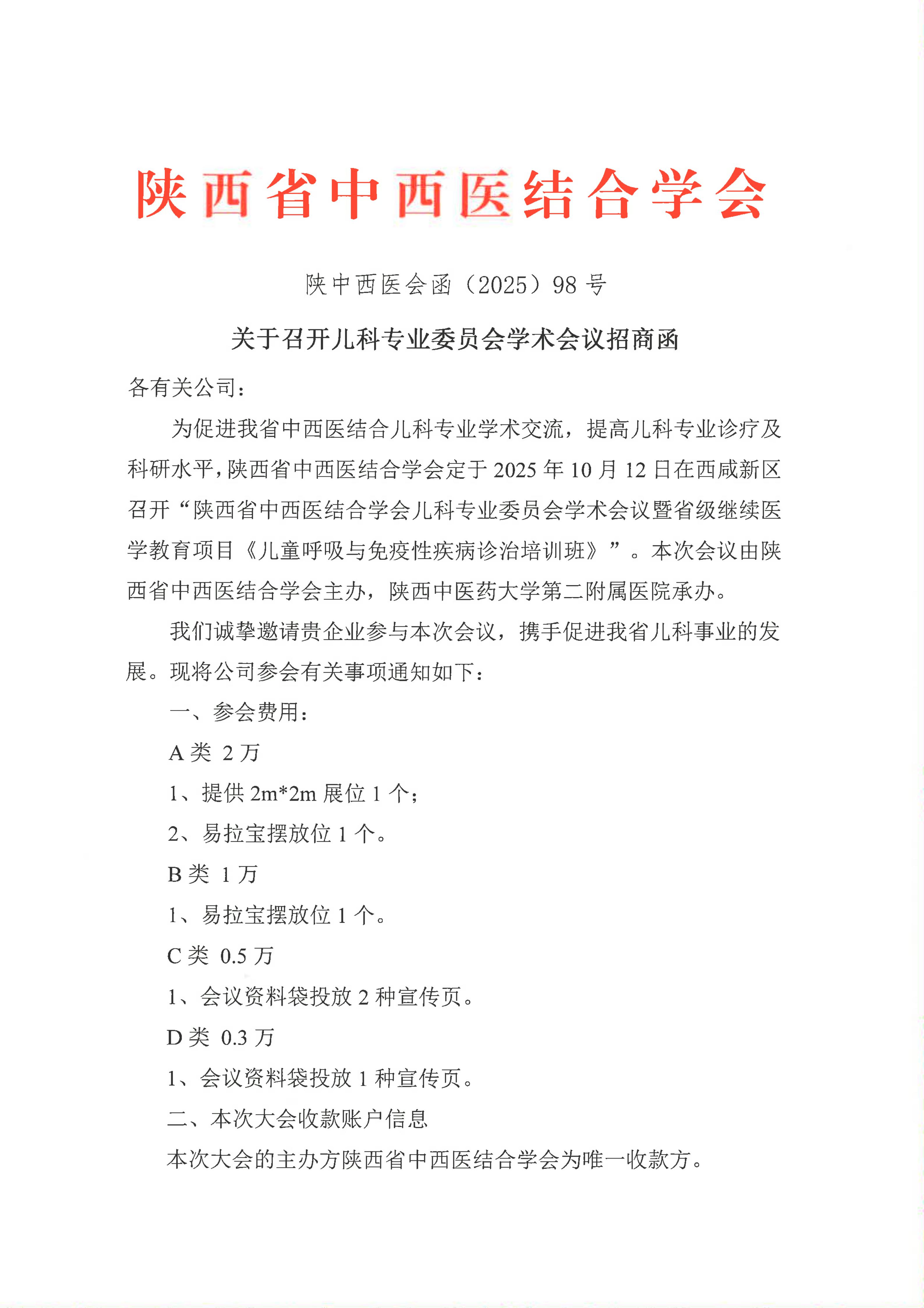 关于召开儿科专业委员会学术会议招商函