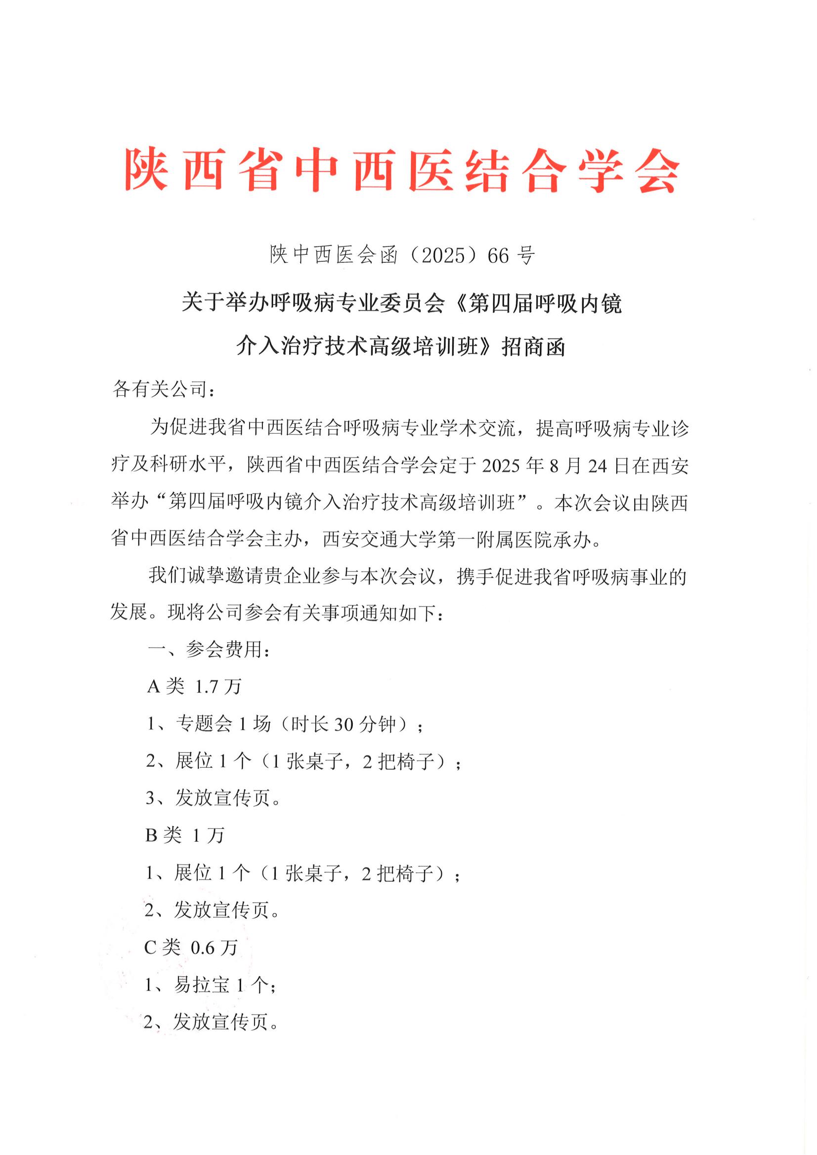 关于举办呼吸病专业委员会《第四届呼吸内镜介入治疗技术高级培训班》招商函