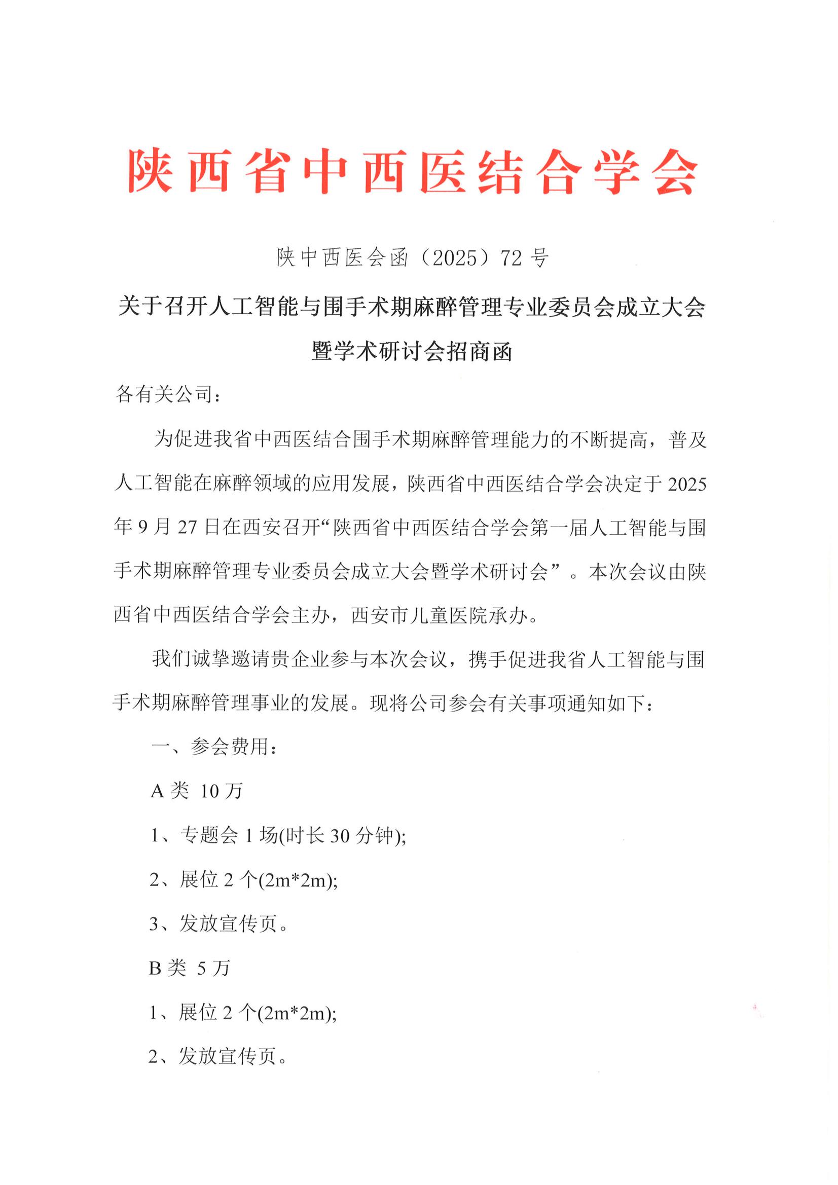 关于召开人工智能与围手术期麻醉管理专业委员会成立大会暨学术研讨会招商函
