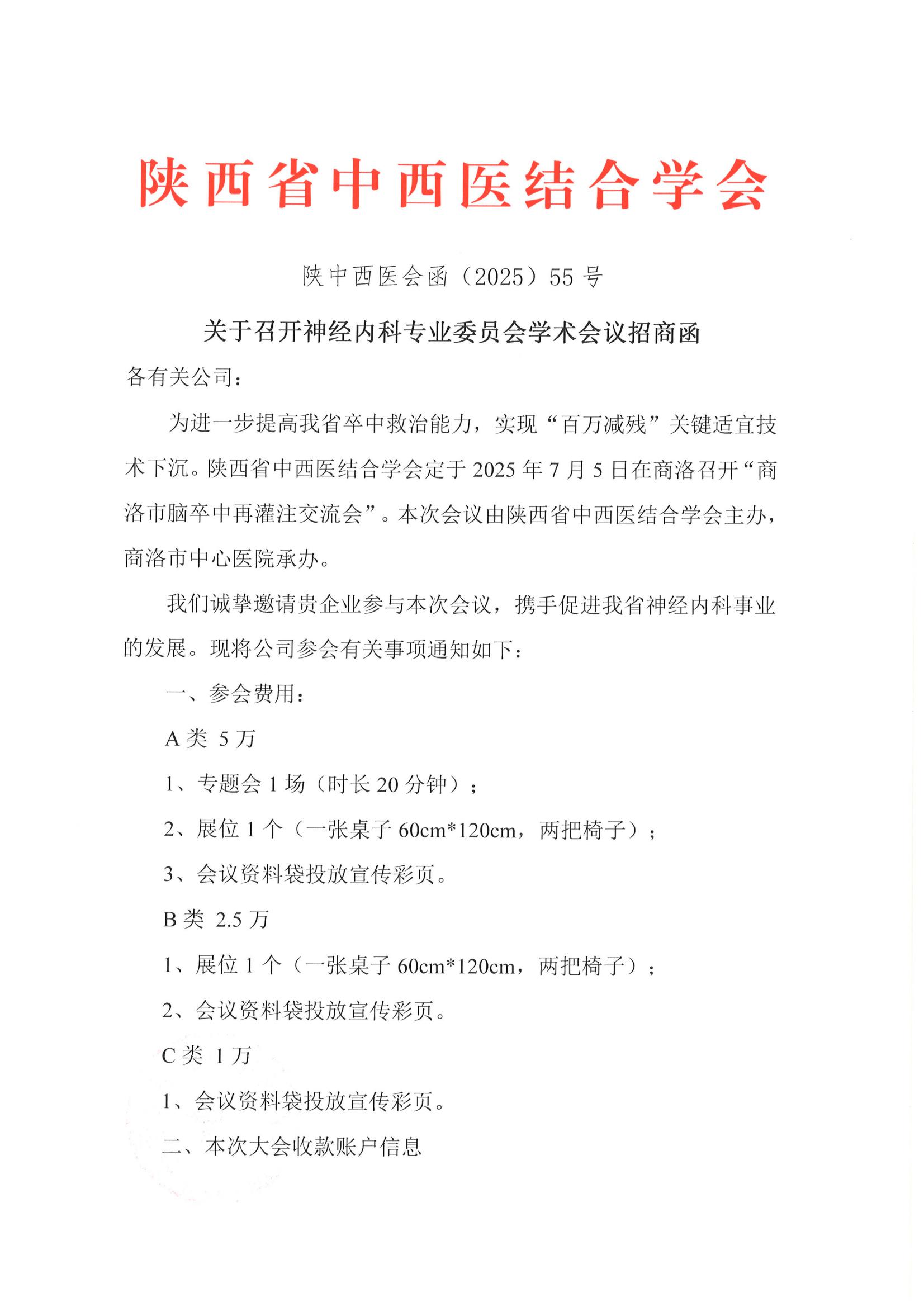关于召开神经内科专业委员会学术会议(商洛)招商函