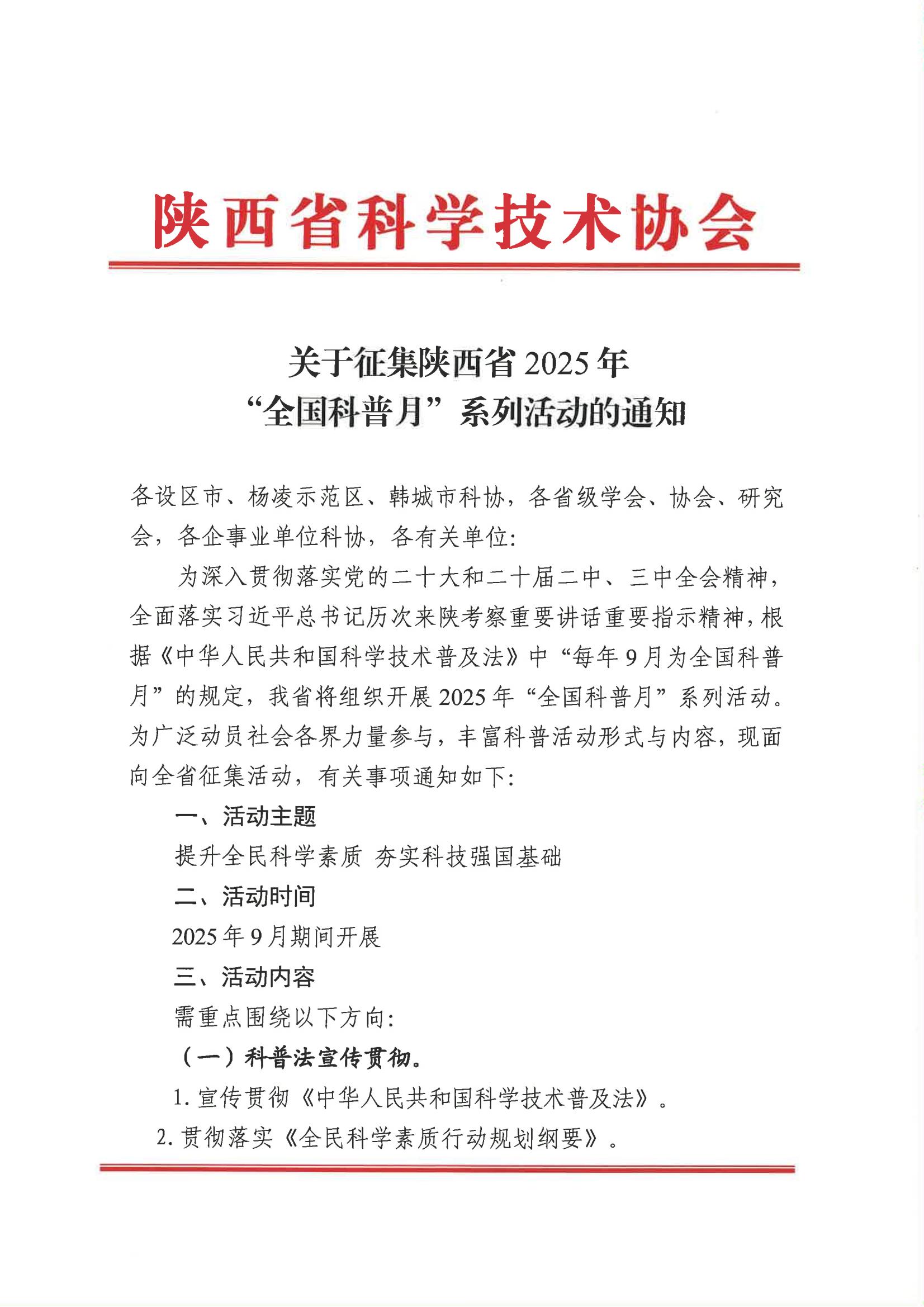关于转发陕西省科学技术协会征集陕西省2025年“全国科普月”系列活动的通知