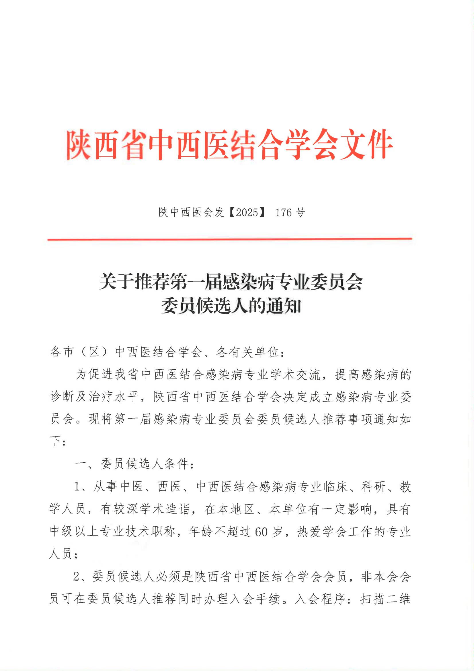 关于推荐第一届感染病专业委员会委员候选人的通知