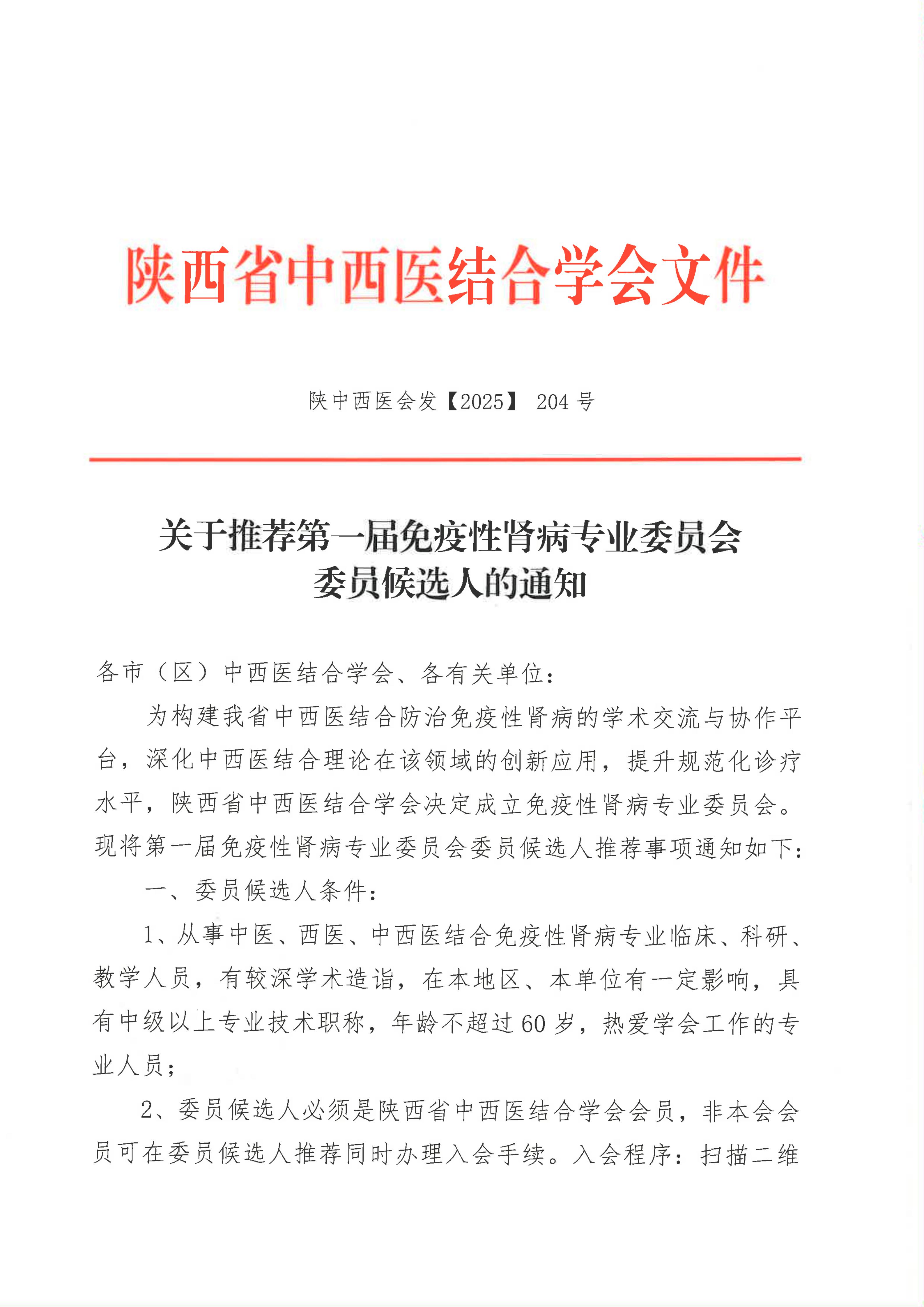 关于推荐第一届免疫性肾病专业委员会委员候选人的通知