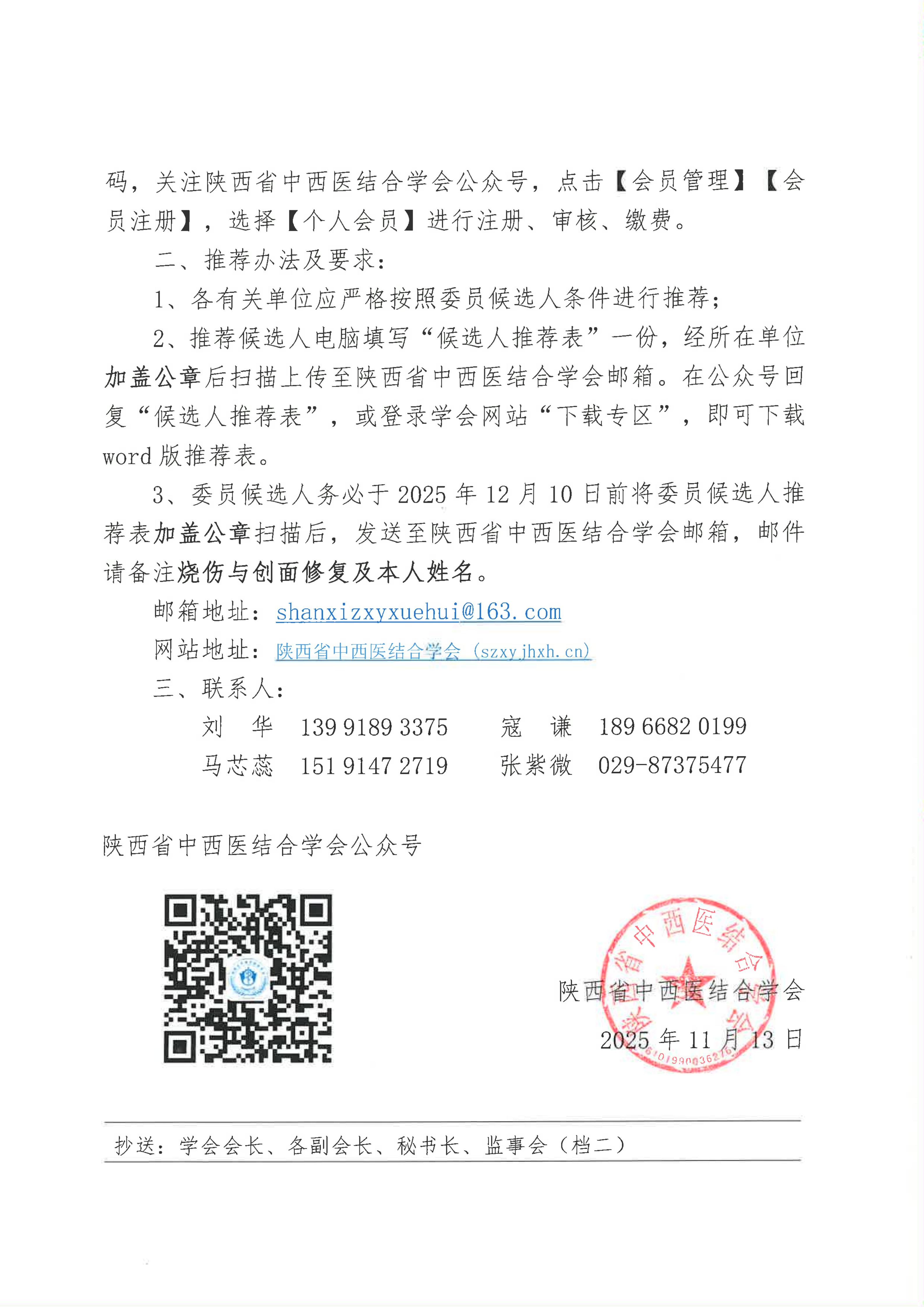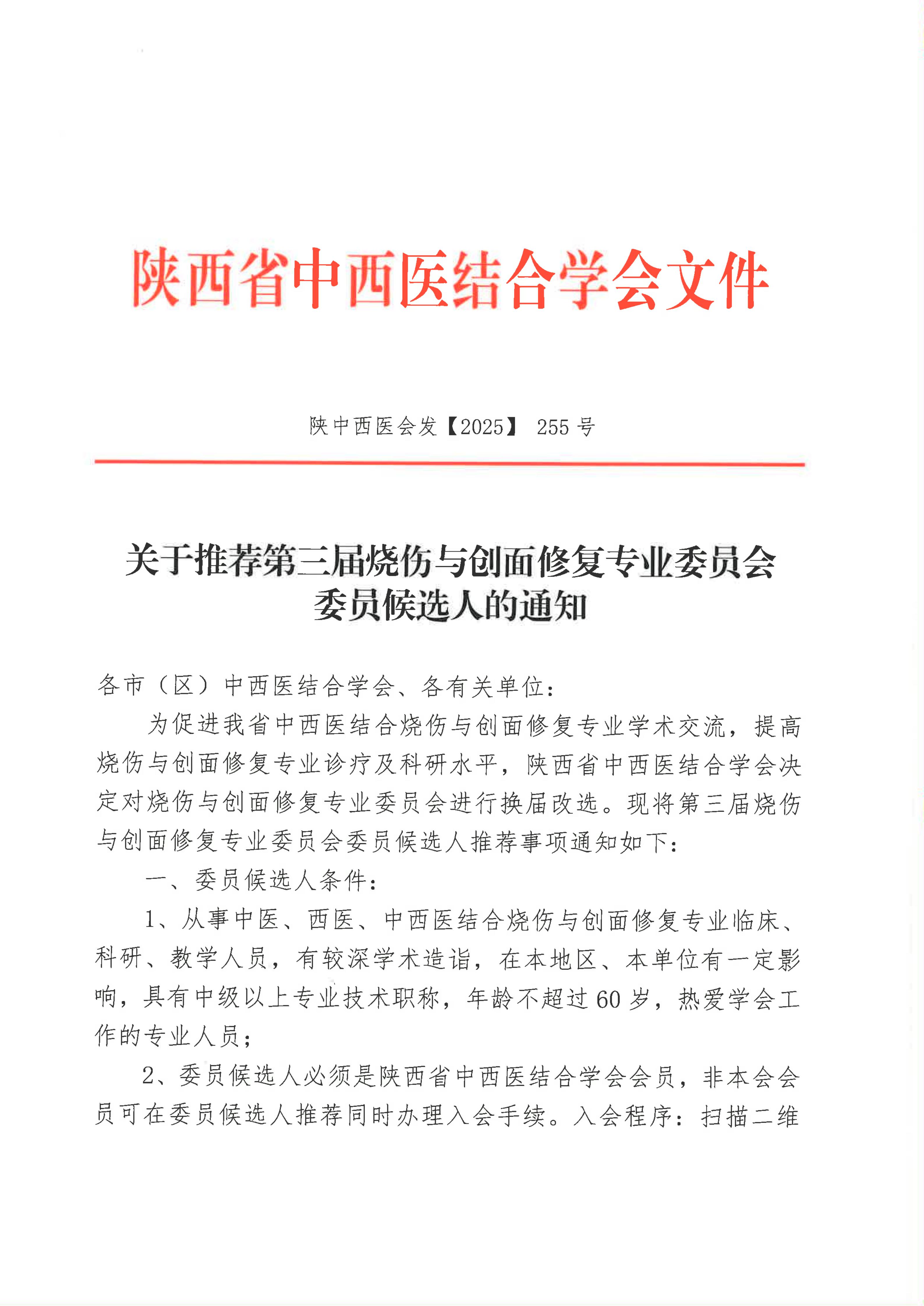关于推荐第三届烧伤与创面修复专业委员会委员候选人的通知