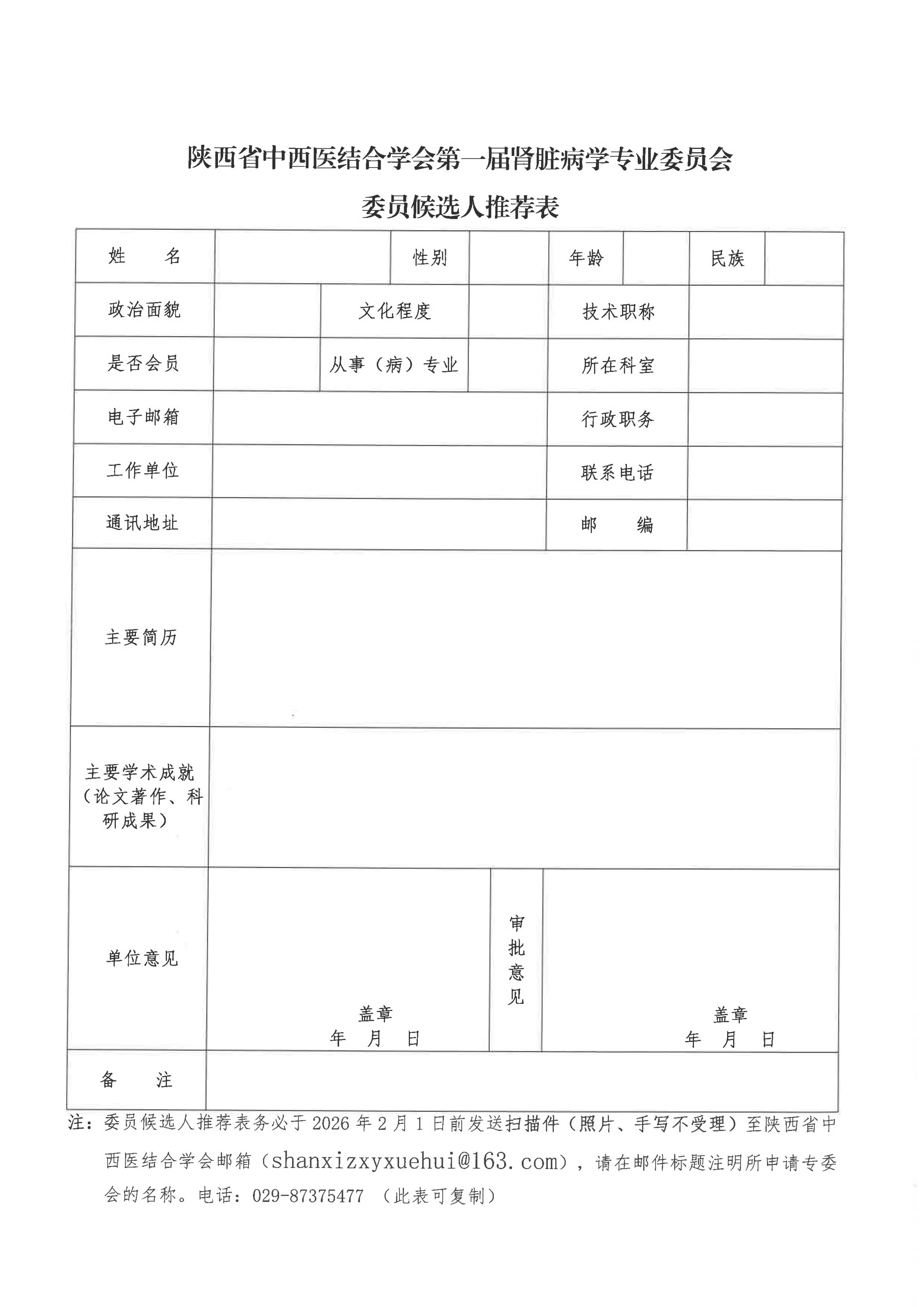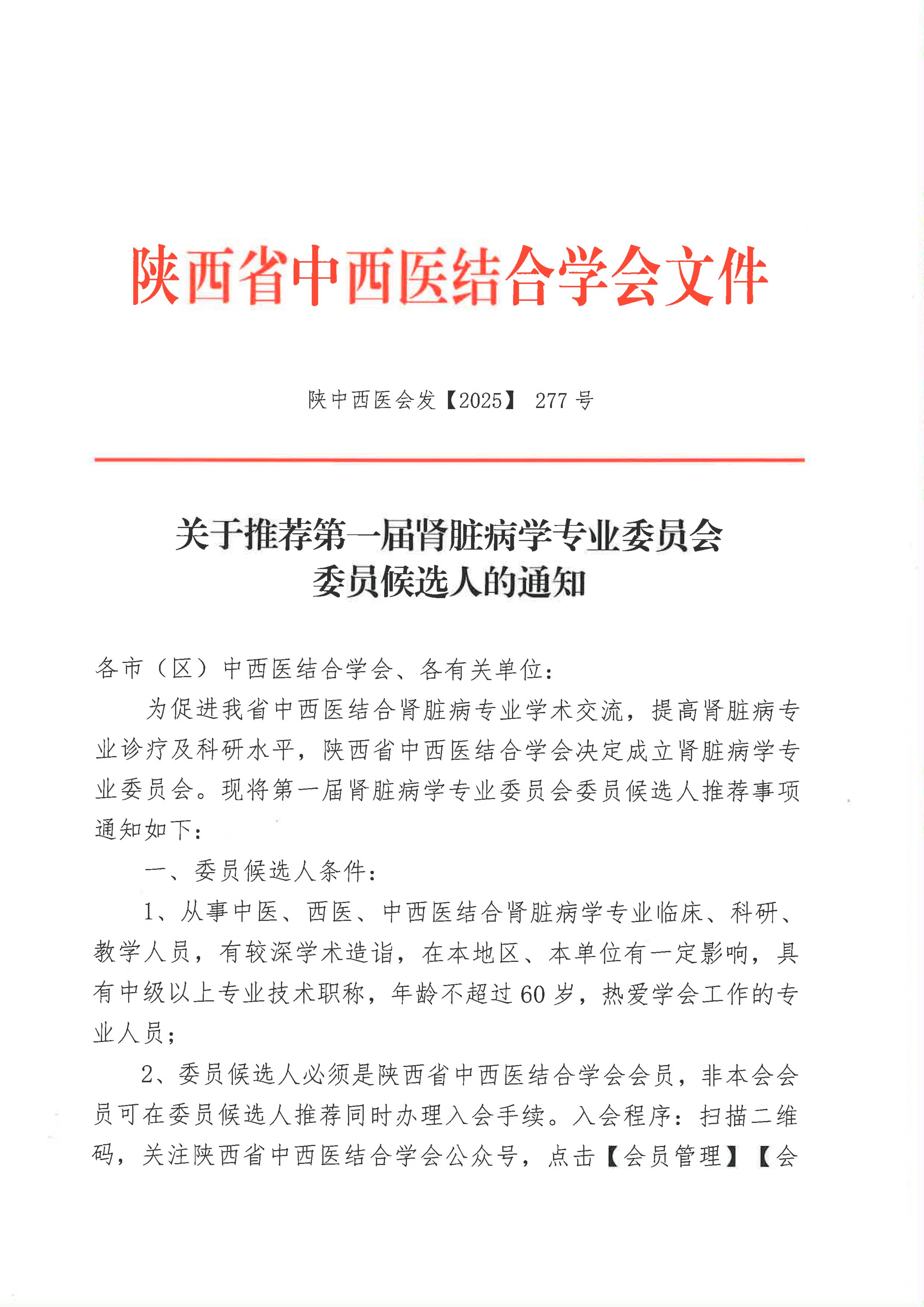 关于推荐第一届肾脏病学专业委员会委员候选人的通知