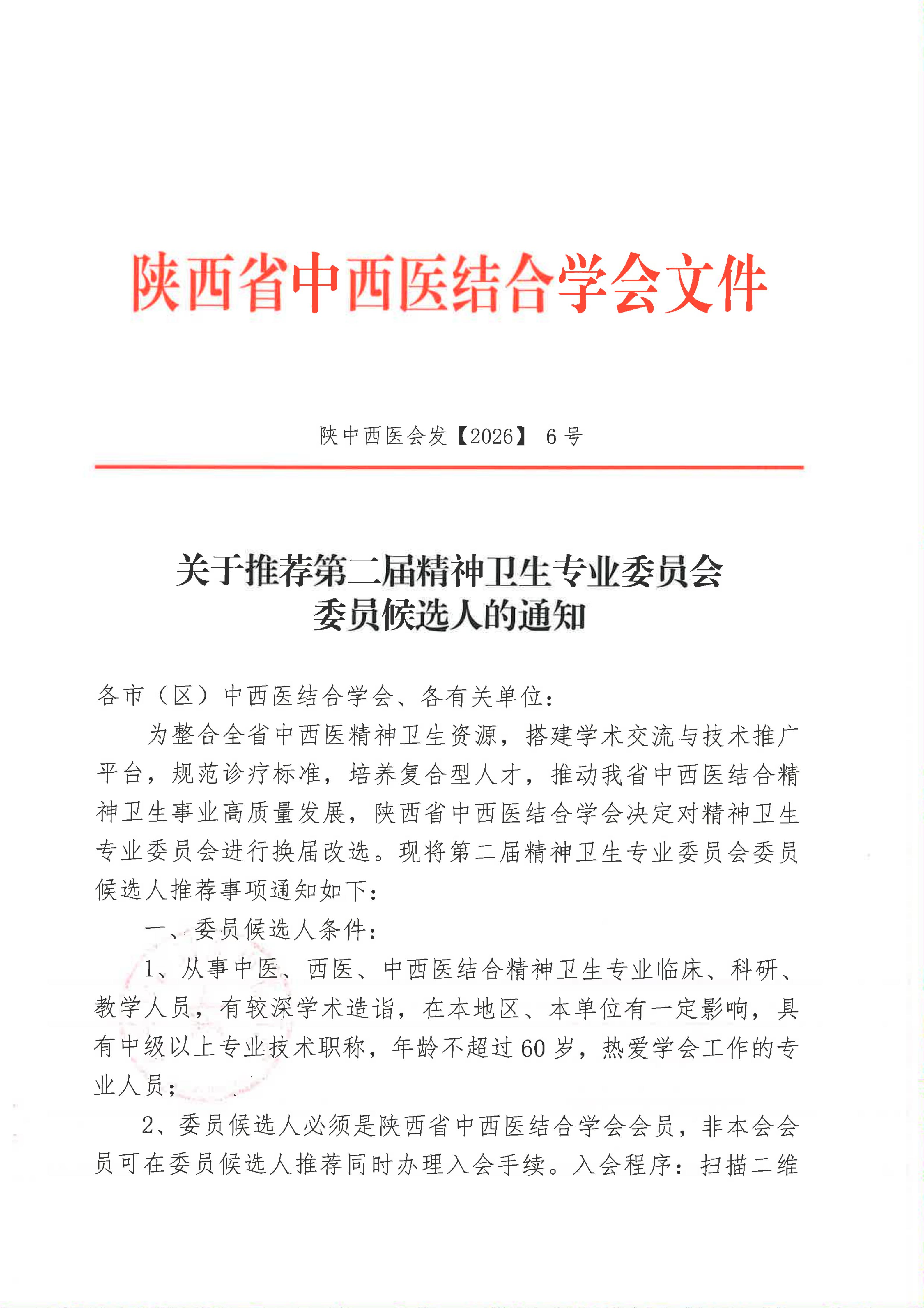 关于推荐第二届精神卫生专业委员会委员候选人的通知