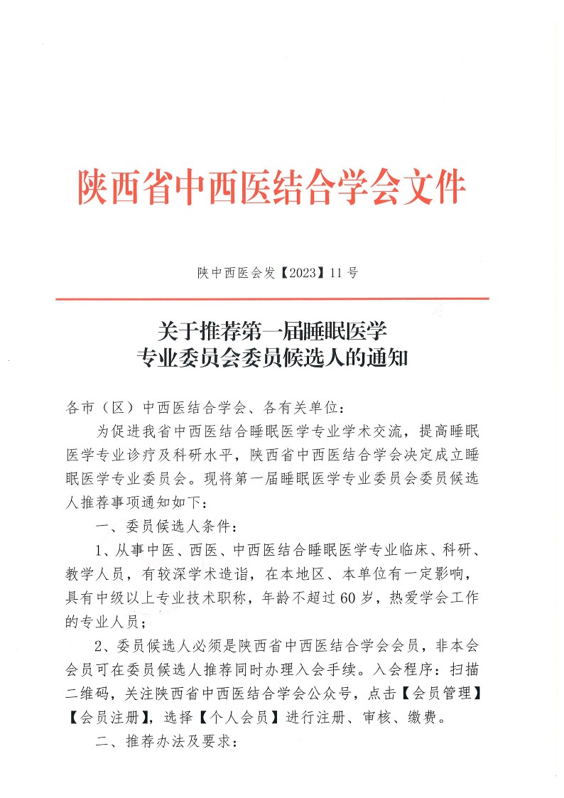 关于推荐第一届睡眠医学专委会委员候选人的通知