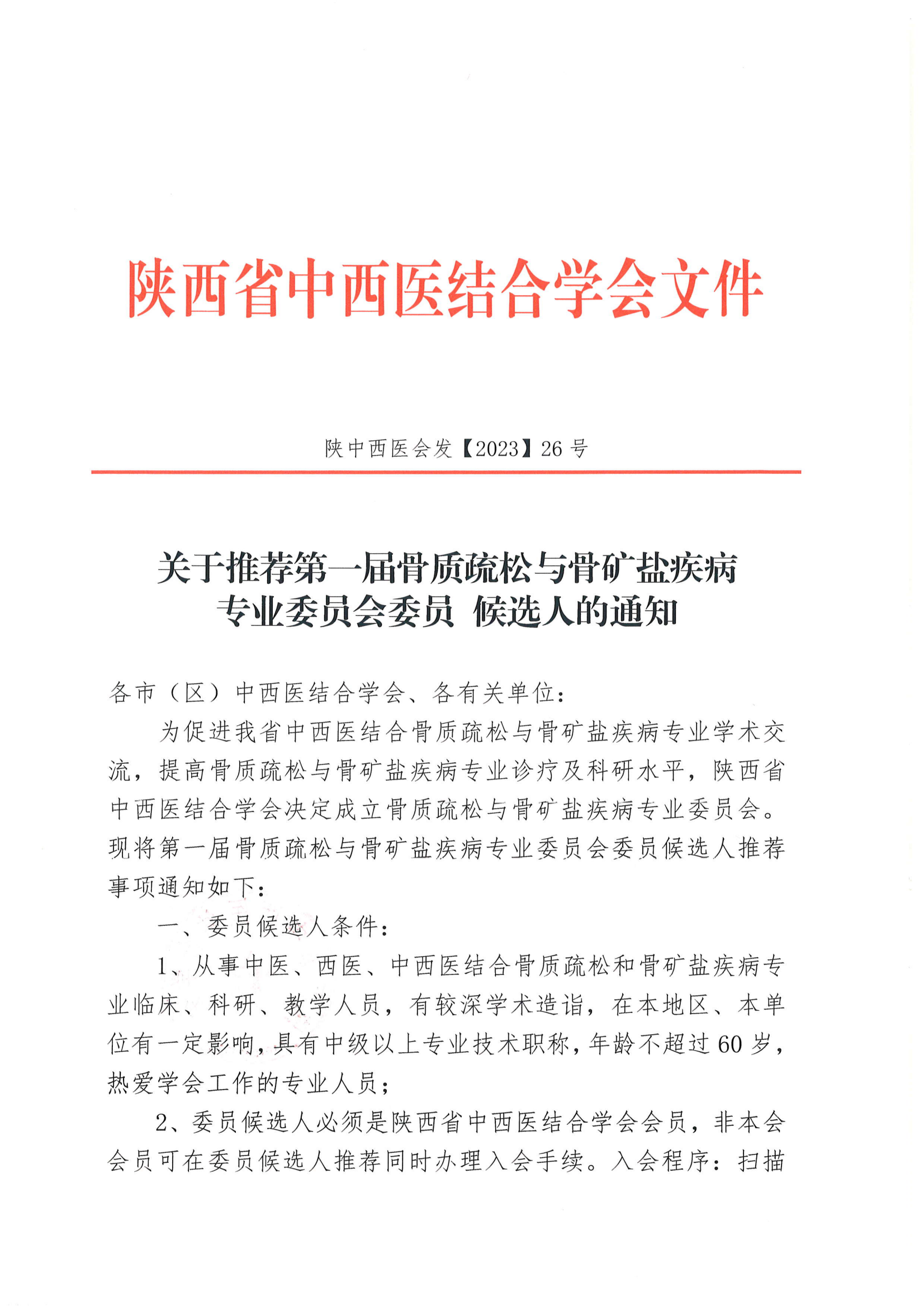 关于推荐第一届骨质疏松与骨矿盐疾病专委会委员候选人的通知