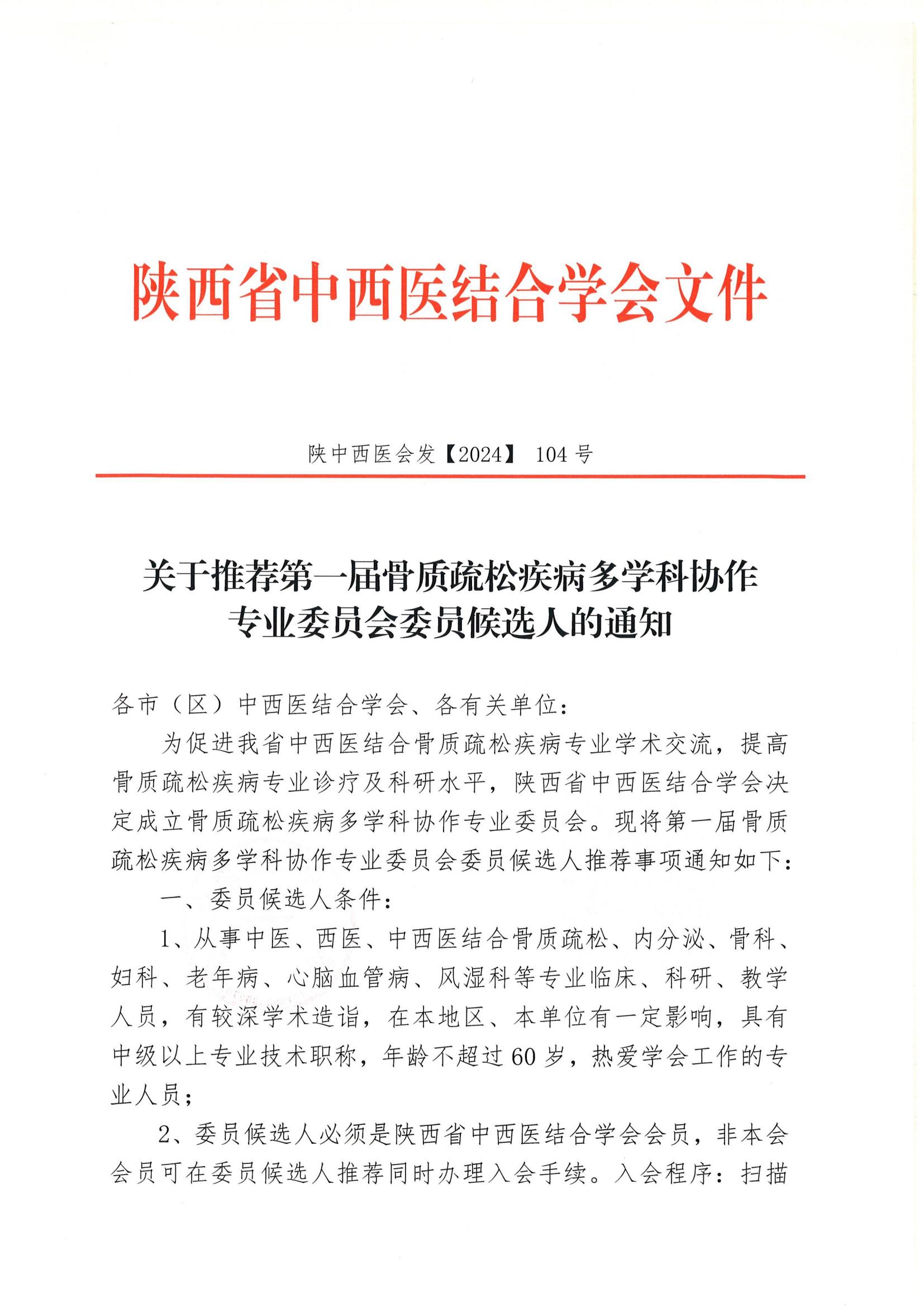 关于推荐第一届骨质疏松疾病多学科协作专业委员会委员候选人的通知