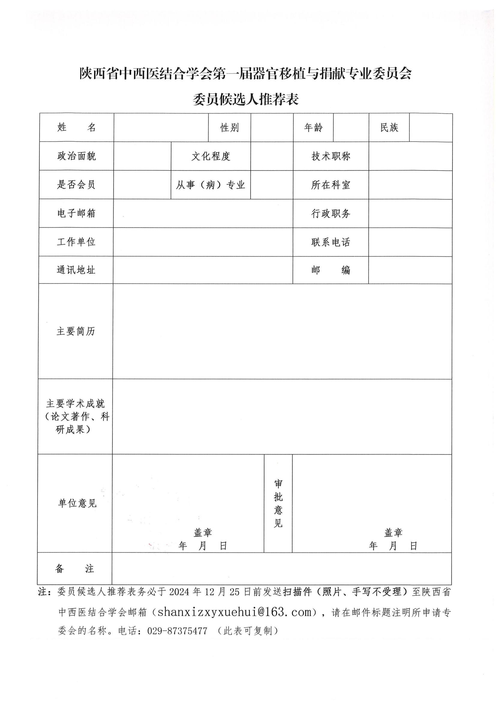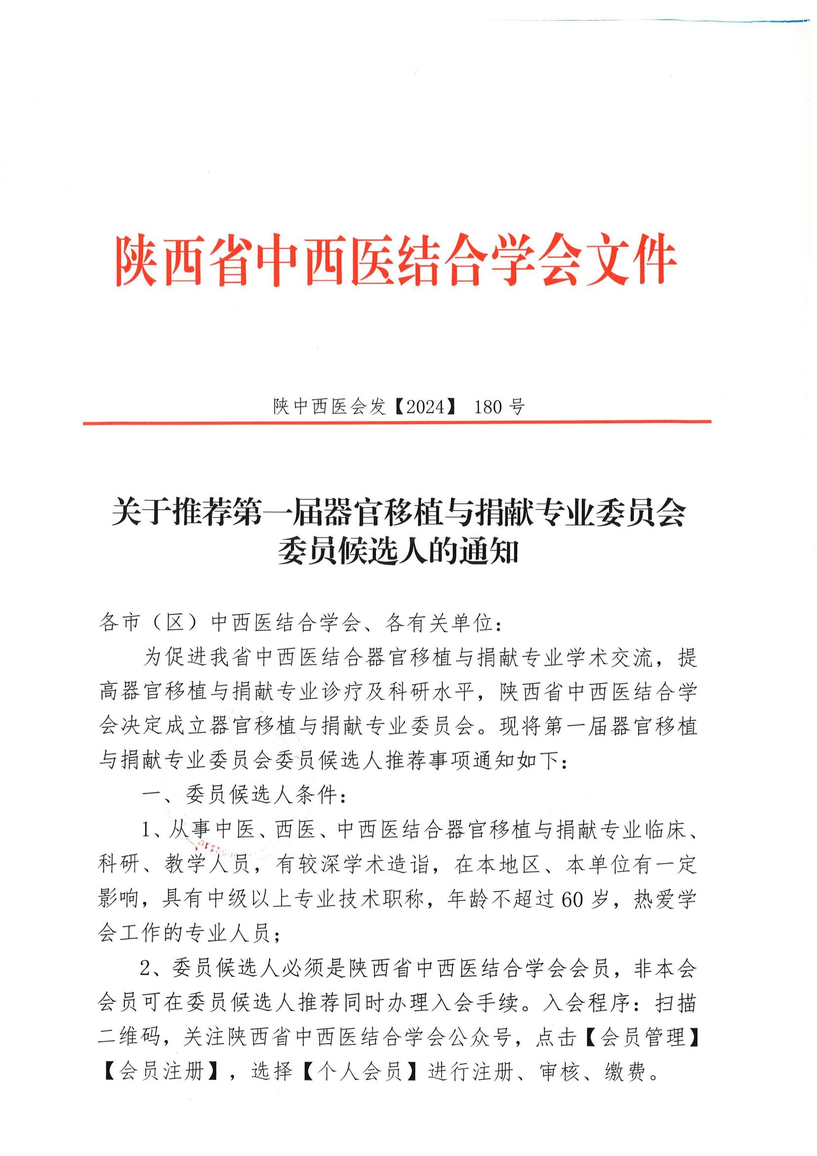 关于推荐第一届器官移植与捐献专业委员会委员候选人的通知
