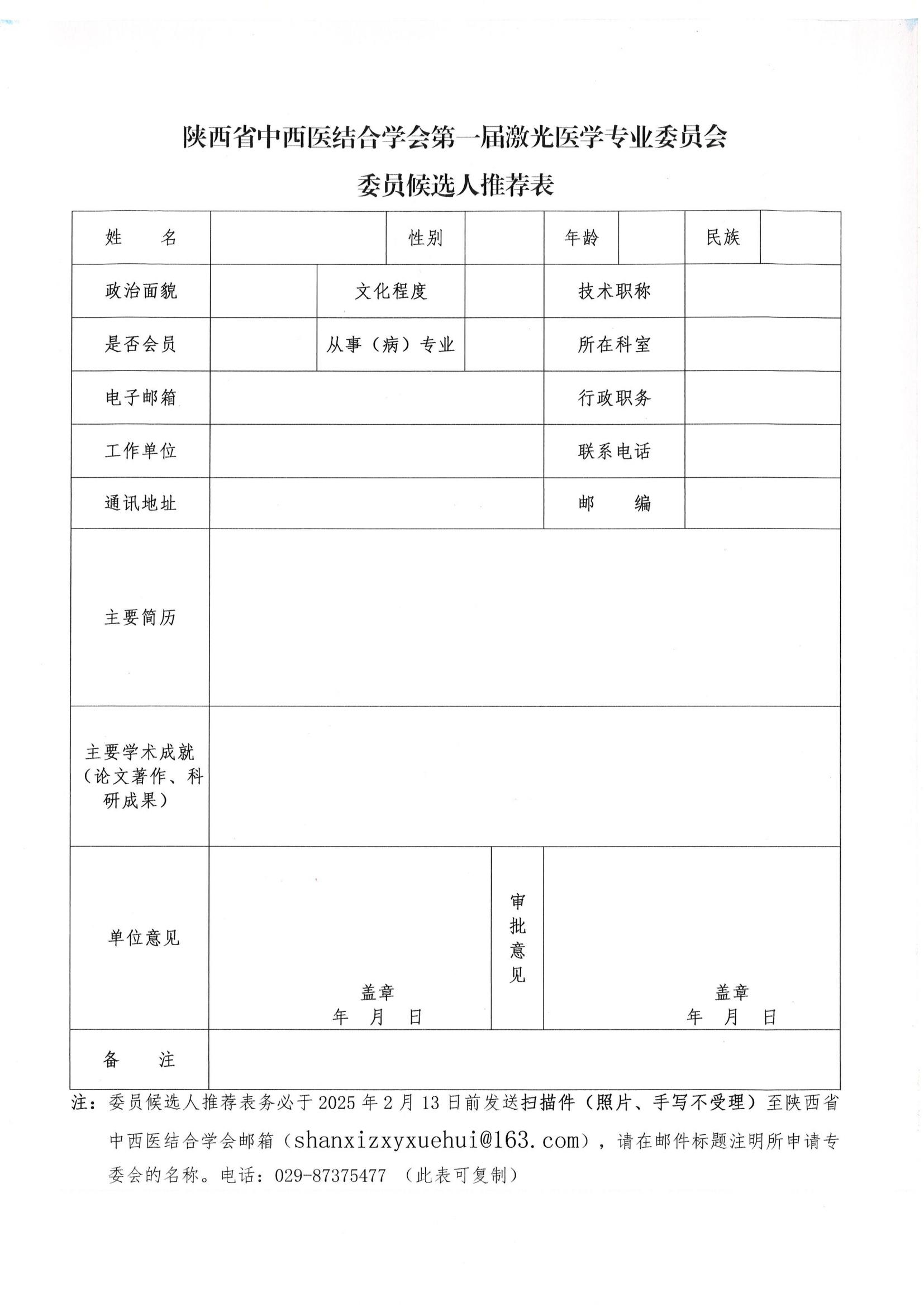 关于推荐第一届激光医学专业委员会委员候选人的通知