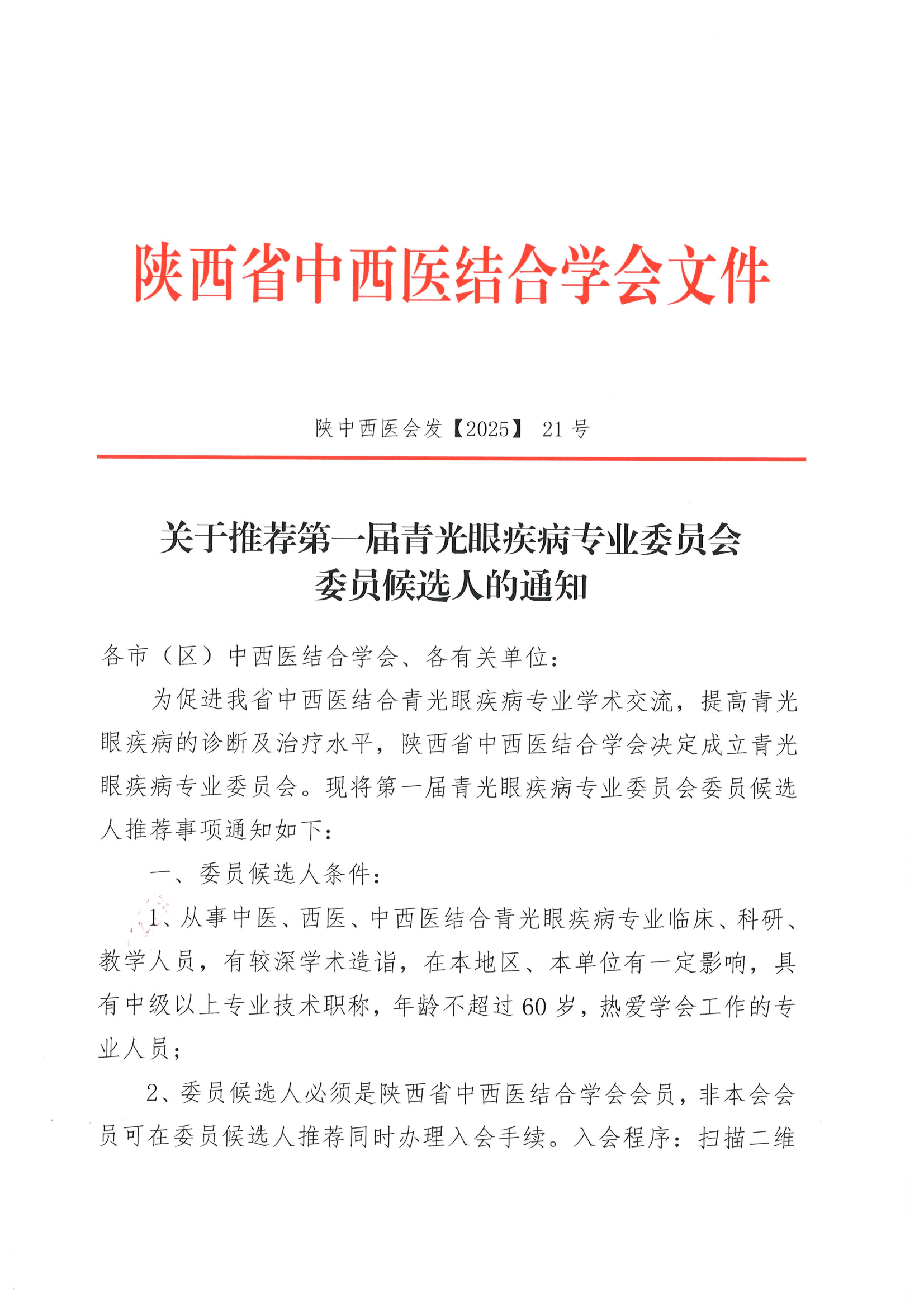 关于推荐第一届青光眼疾病专业委员会委员候选人的通知