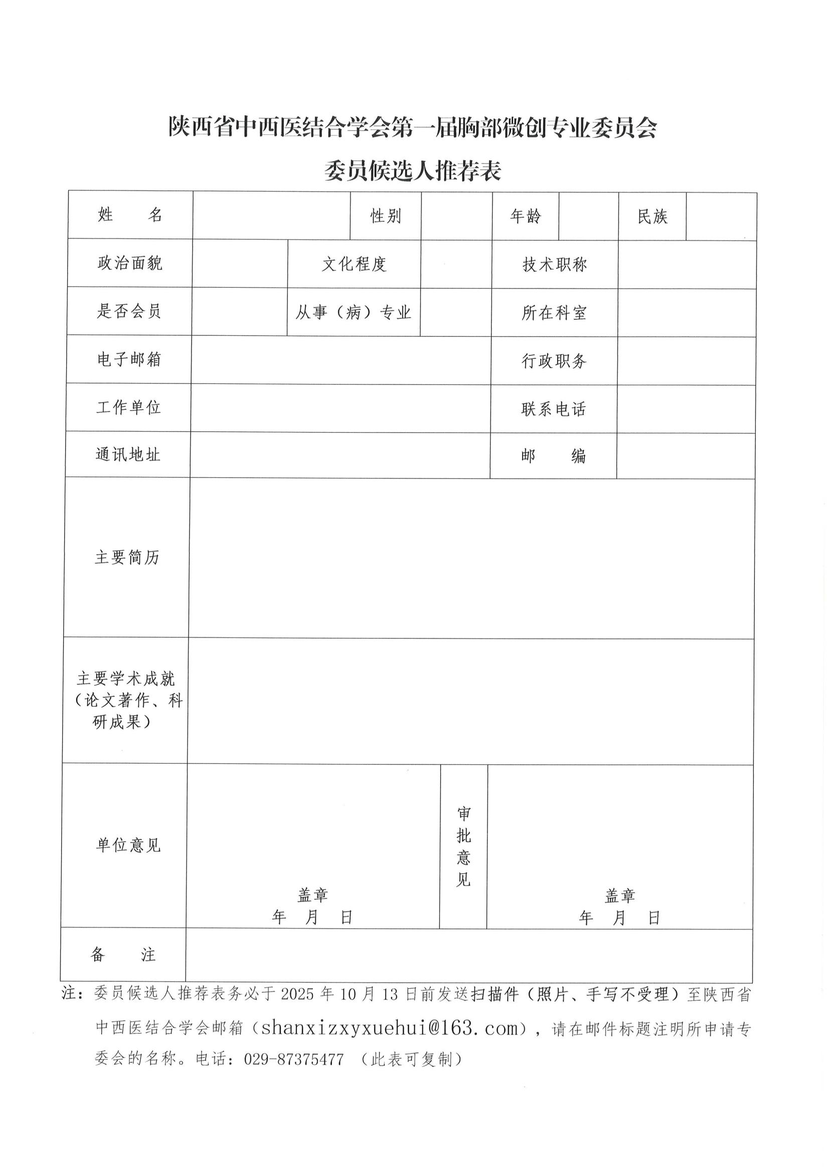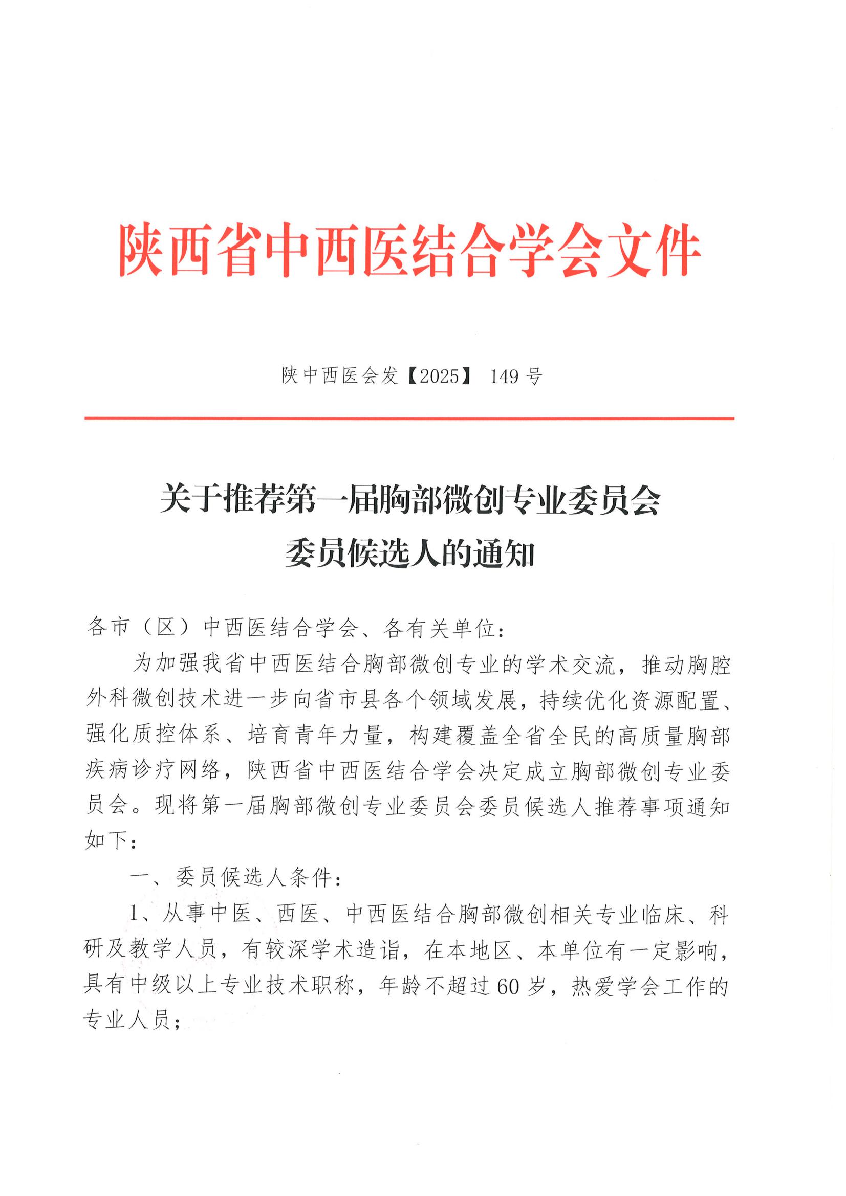 关于推荐第一届胸部微创专业委员会委员候选人的通知