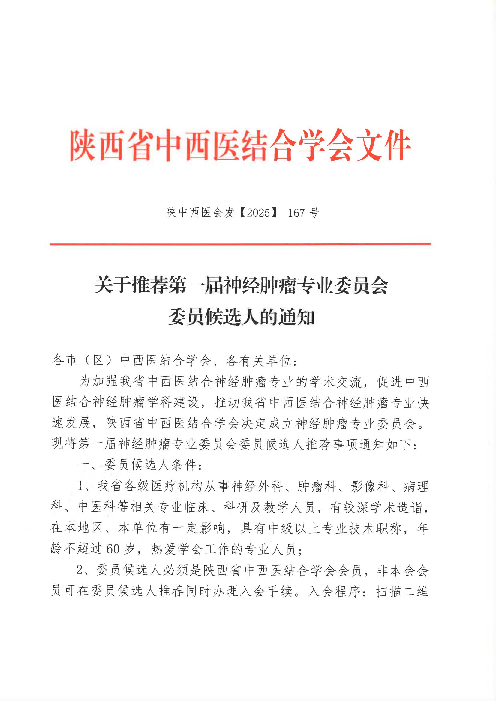 关于推荐第一届神经肿瘤专业委员会委员候选人的通知
