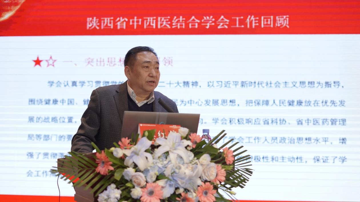 陕西省中医药管理局副局长赵文讲话,他强调:中西医并重是我国基础方针之一,中西医结合在国家政策的支持下取得了长足进步,党的二十大为我们在新时代新征程做好中西医结合工作提供了根本遵循,指明了发展方向。他说:省中医药管理局作为学会的行业指导部门,将大力支持学会医疗、人才培养工作,同时希望学会以此次大会为契机,做到,一、进一步依靠和发挥学术团体的桥梁作用。充分调动广大中西医结合专业人才的积极性,力争在实现中医药现代化和中西医结合医学的系统发展方面取得突破性的进展。二、推动科技成果转化,加快学术发展。发扬学术民主,提倡创新意识,促进中西医结合学科的发展和繁荣。三、切实加强中西医结合人才培养。采取积极措施,通过多种形式、多种途径,加快、加大中西医结合人才培养的进度和力度。