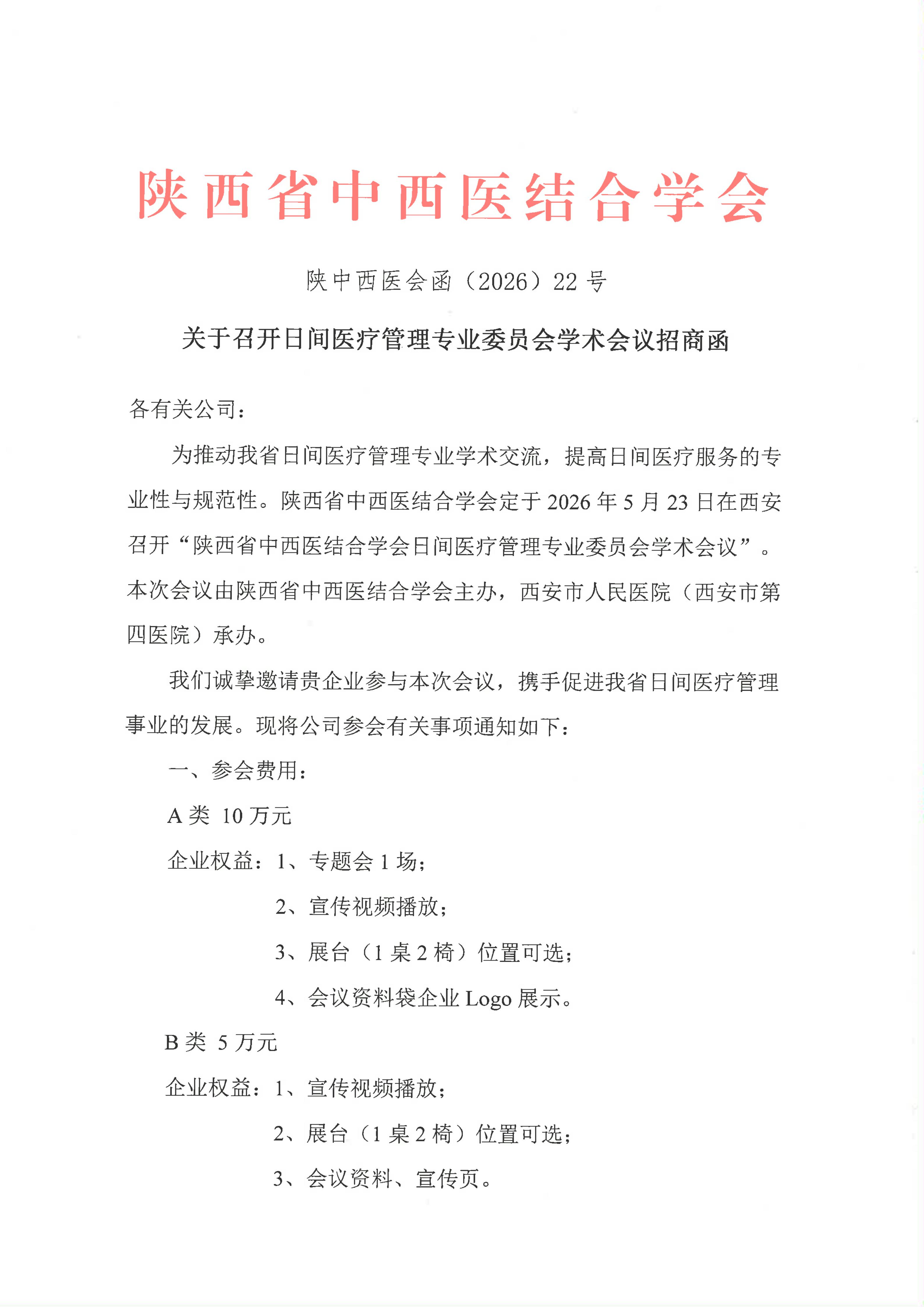 关于召开日间医疗管理专业委员会学术会议招商函