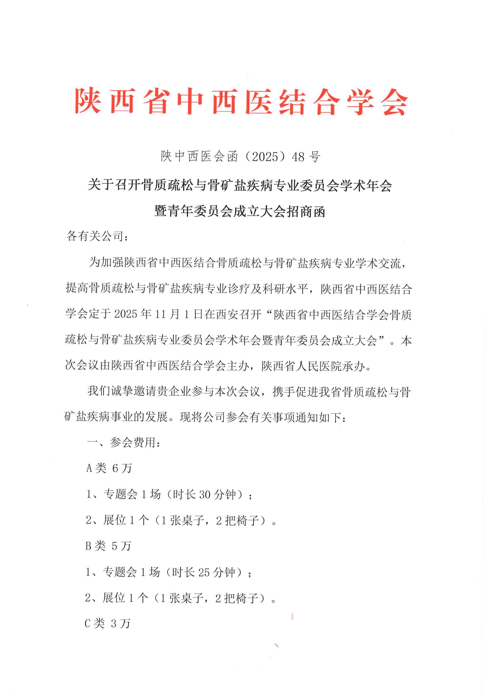 关于召开骨质疏松与骨矿盐疾病专业委员会学术年会暨青年委员会成立大会招商函