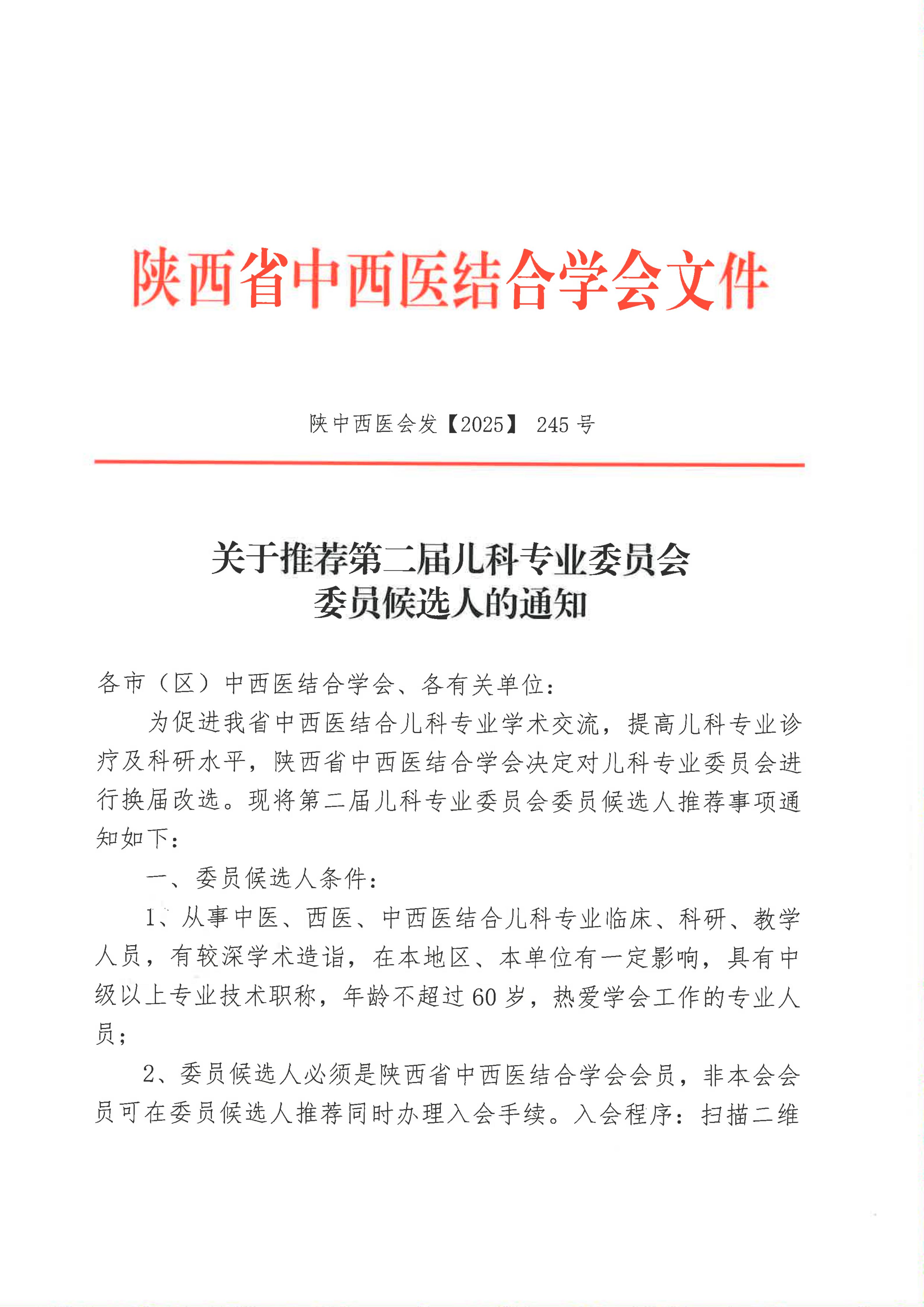 关于推荐第二届儿科专业委员会委员候选人的通知