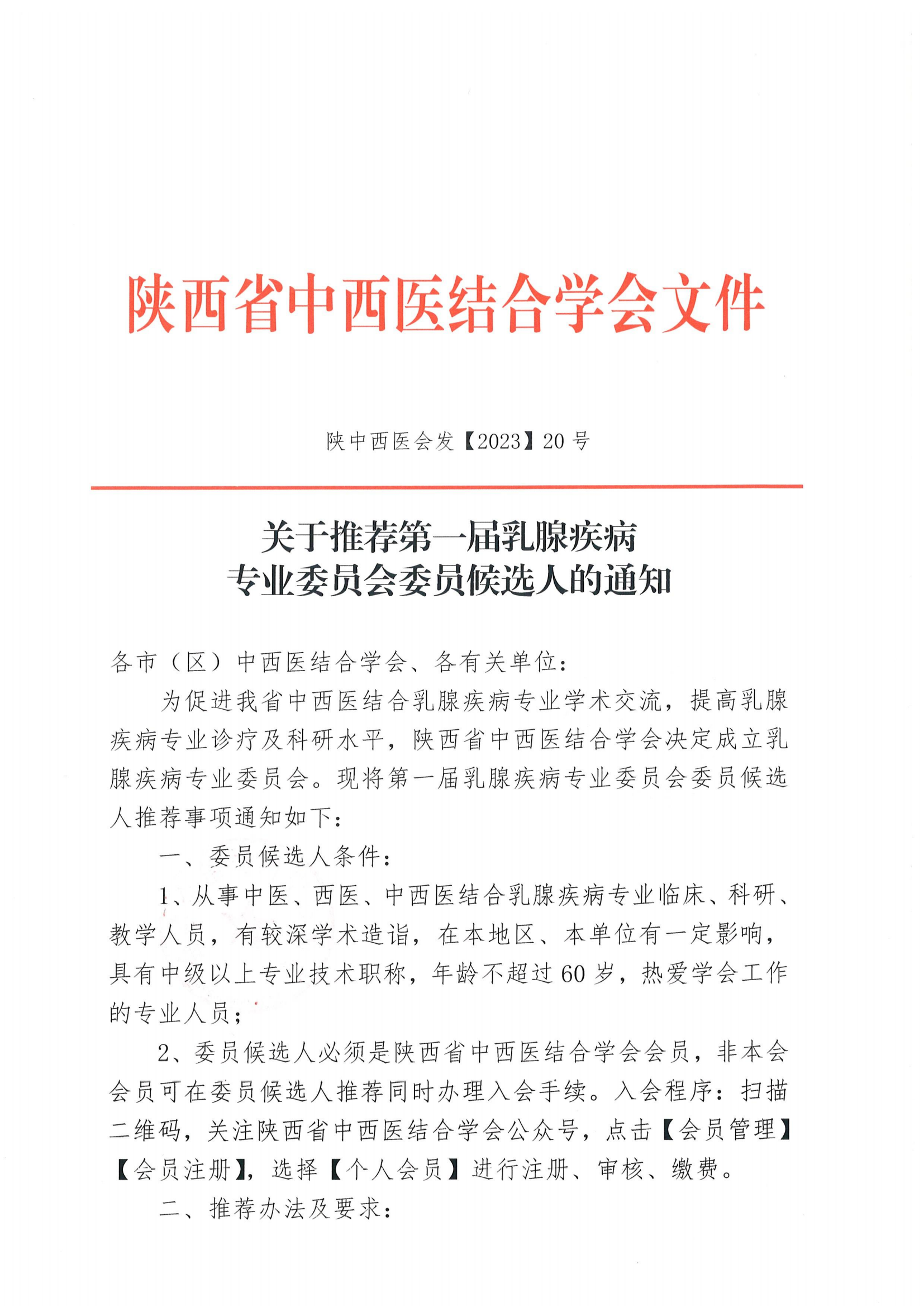 关于推荐第一届乳腺疾病专业委员会委员候选人的通知