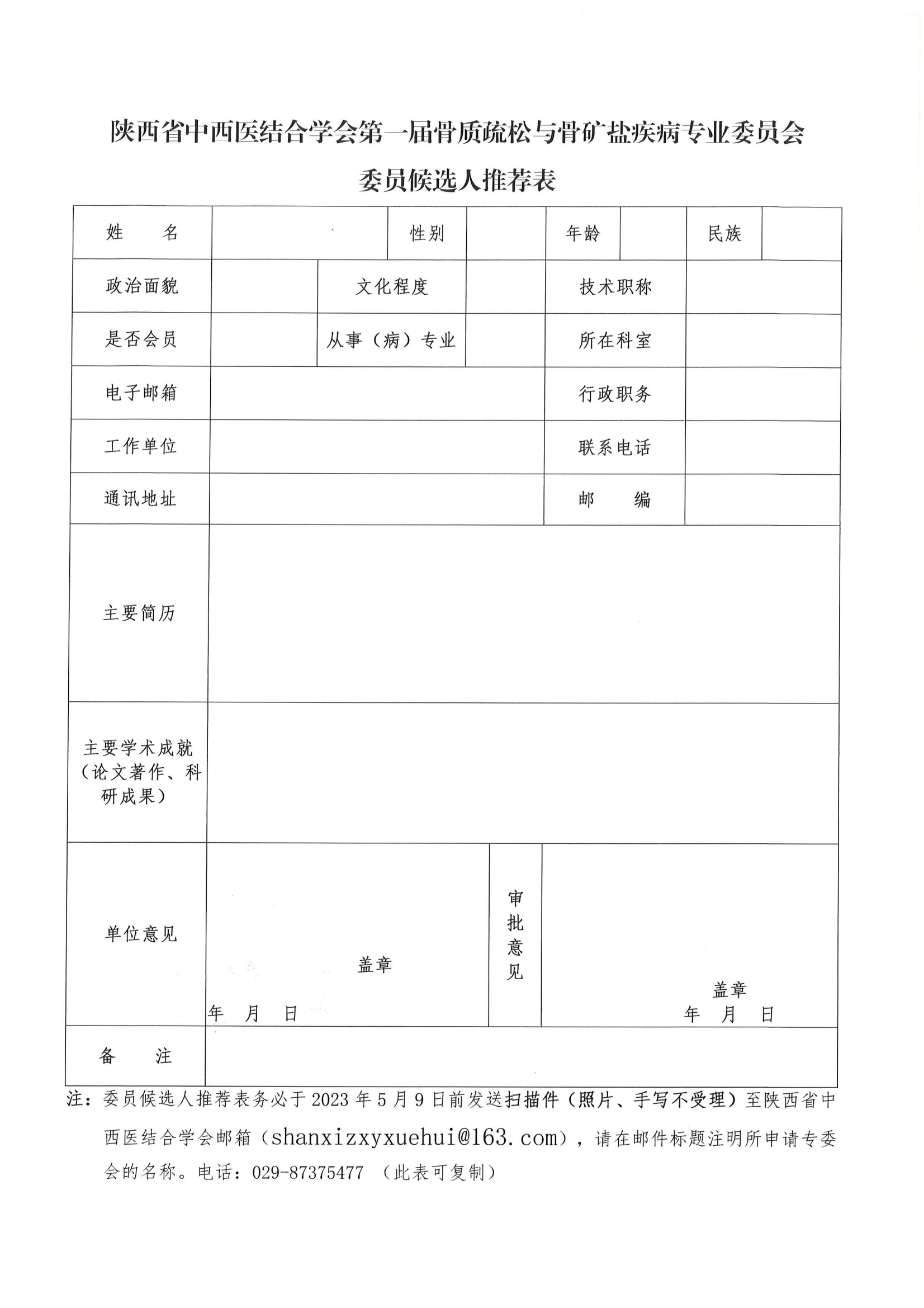 关于推荐第一届骨质疏松与骨矿盐疾病专委会委员候选人的通知
