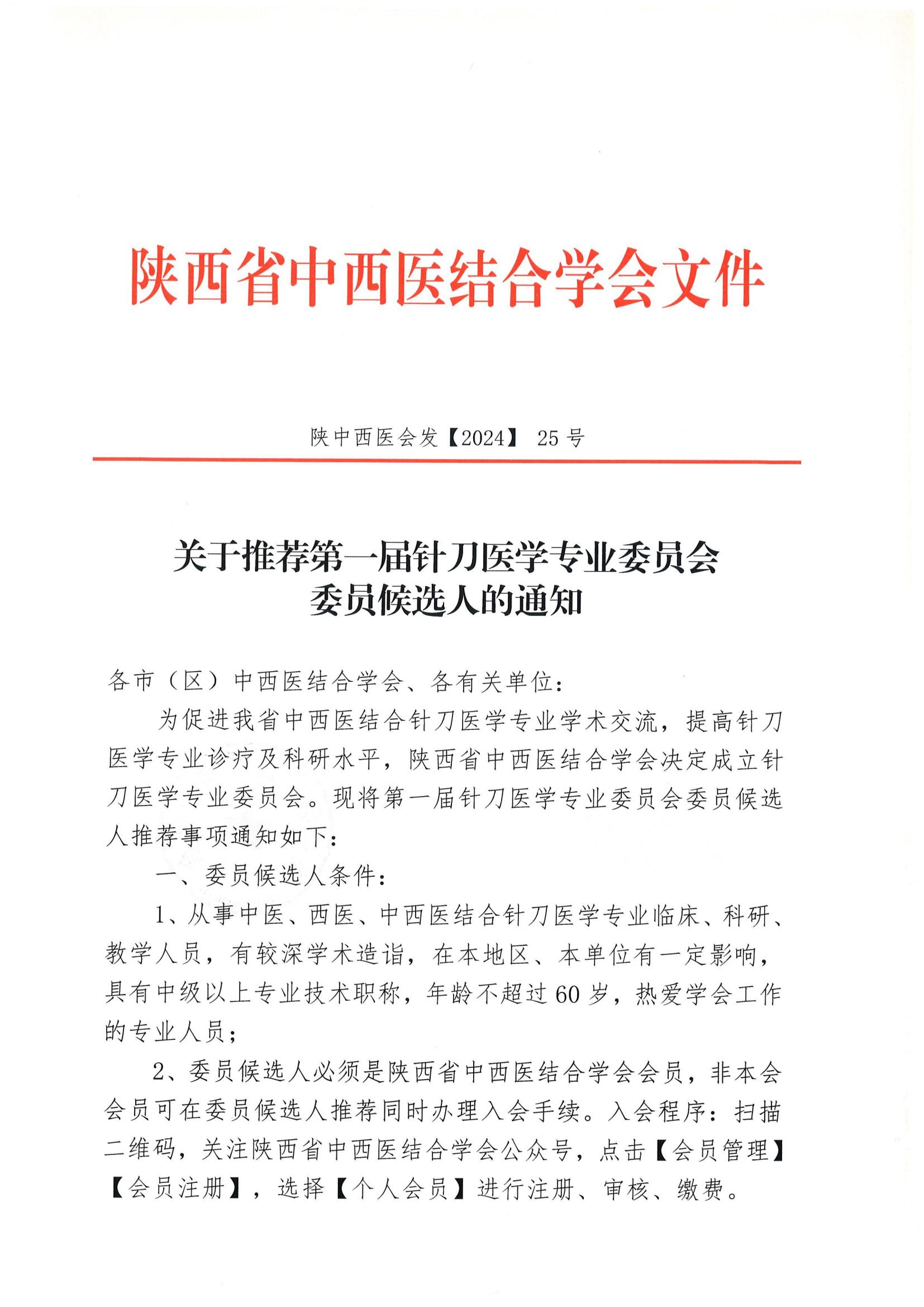 关于推荐第一届针刀医学专业委员会委员候选人的通知