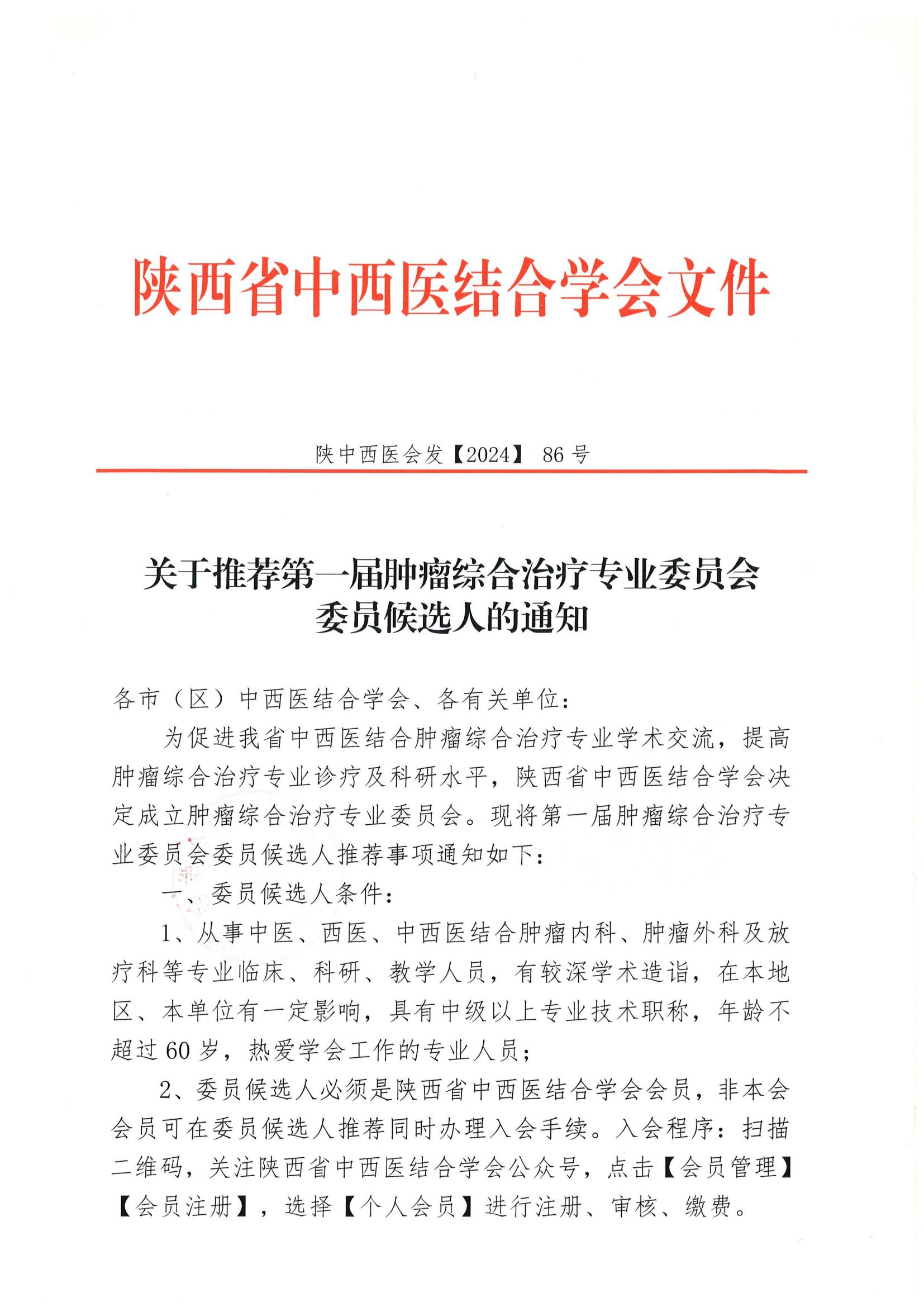 关于推荐第一届肿瘤综合治疗专业委员会委员候选人的通知