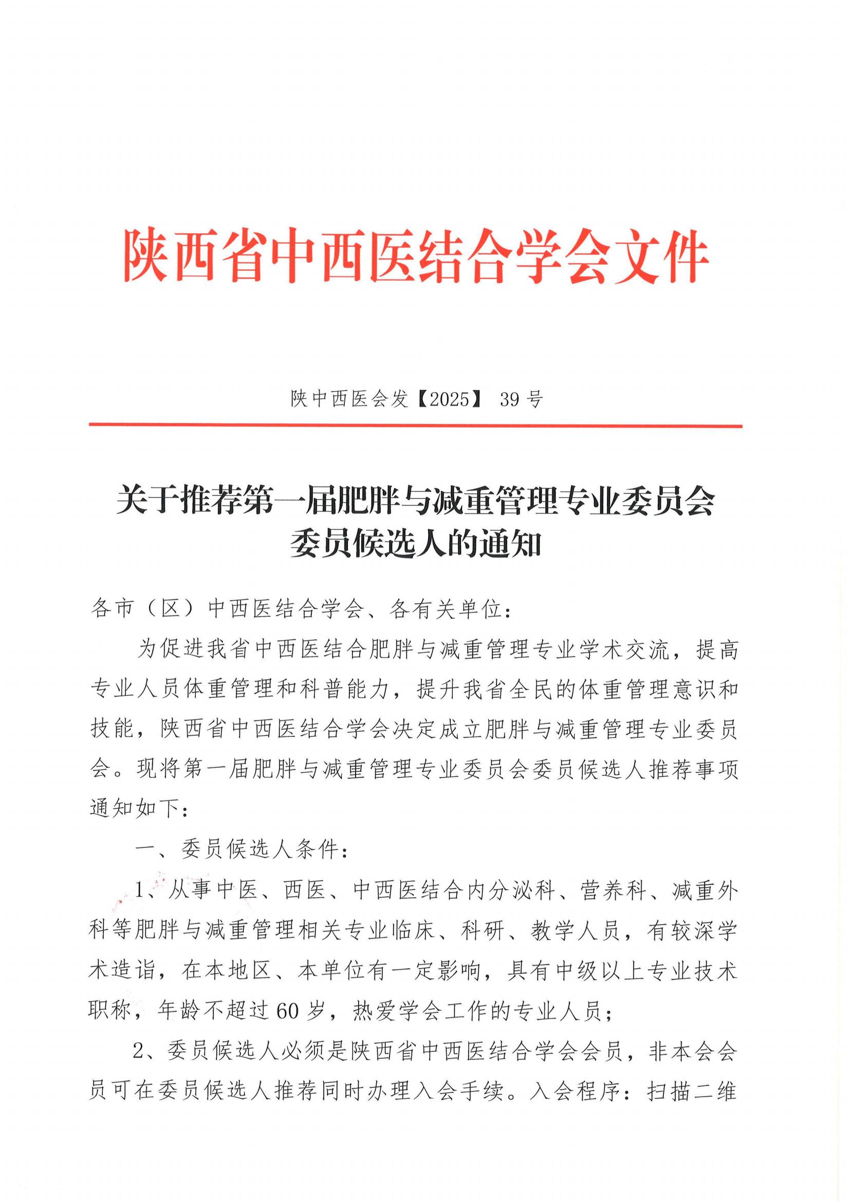 关于推荐第一届肥胖与减重管理专业委员会委员候选人的通知