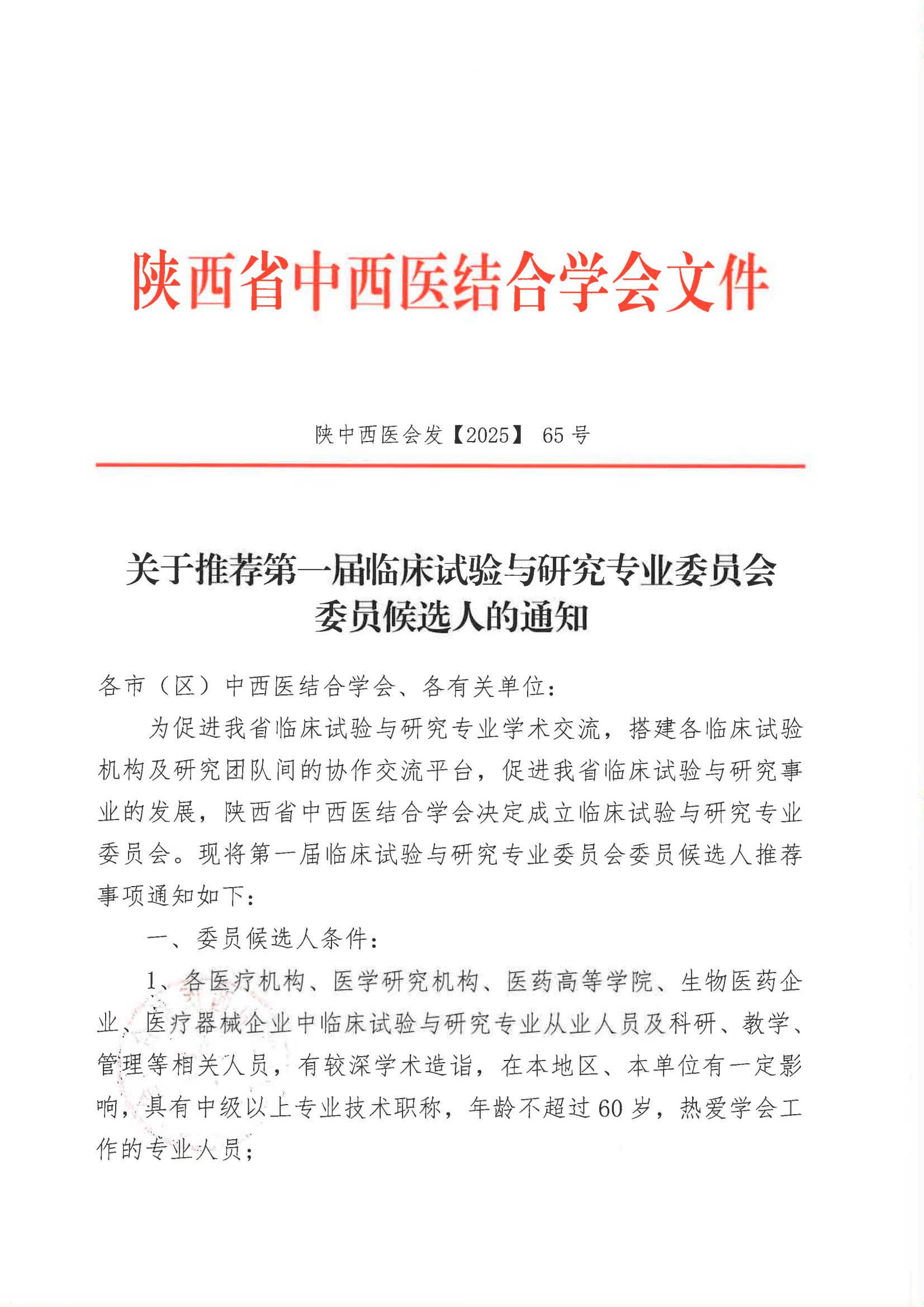 关于推荐第一届临床试验与研究专业委员会委员候选人的通知